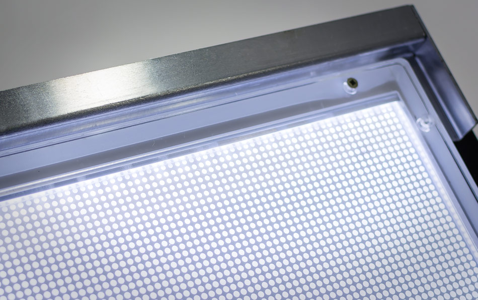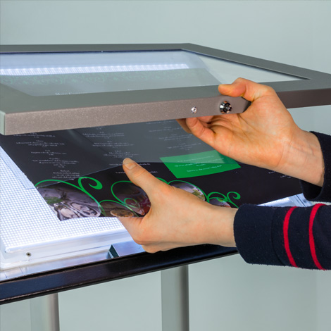 Our display cases feature an ultra bright, long lasting LED backlit panel that provides fantastic lighting for your information and has a life span of apporximately 50,000 hours. They come with a transformer to convert power supply to low voltage, alternatively we offer an optional battery supply with our free standing models.